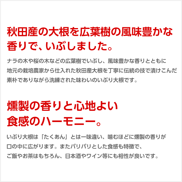 【秋田名産 いぶり大根の商品詳細】 いぶり大根とは、漬物として使う干し大根が凍ってしまうのを防ぐため、 大根を囲炉裏の上に吊るして燻し、米ぬかで漬け込んだ雪国秋田の伝統的な漬物です。 秋田の方言で漬物のことを「大根」と呼ぶことからその名がつけられました。 ナラの木や桜の木などの広葉樹でいぶし、風味豊かな香りとともに 地元の栽培農家から仕入れた秋田産大根を丁寧に伝統の技で漬けこんだ 素朴でありながら...