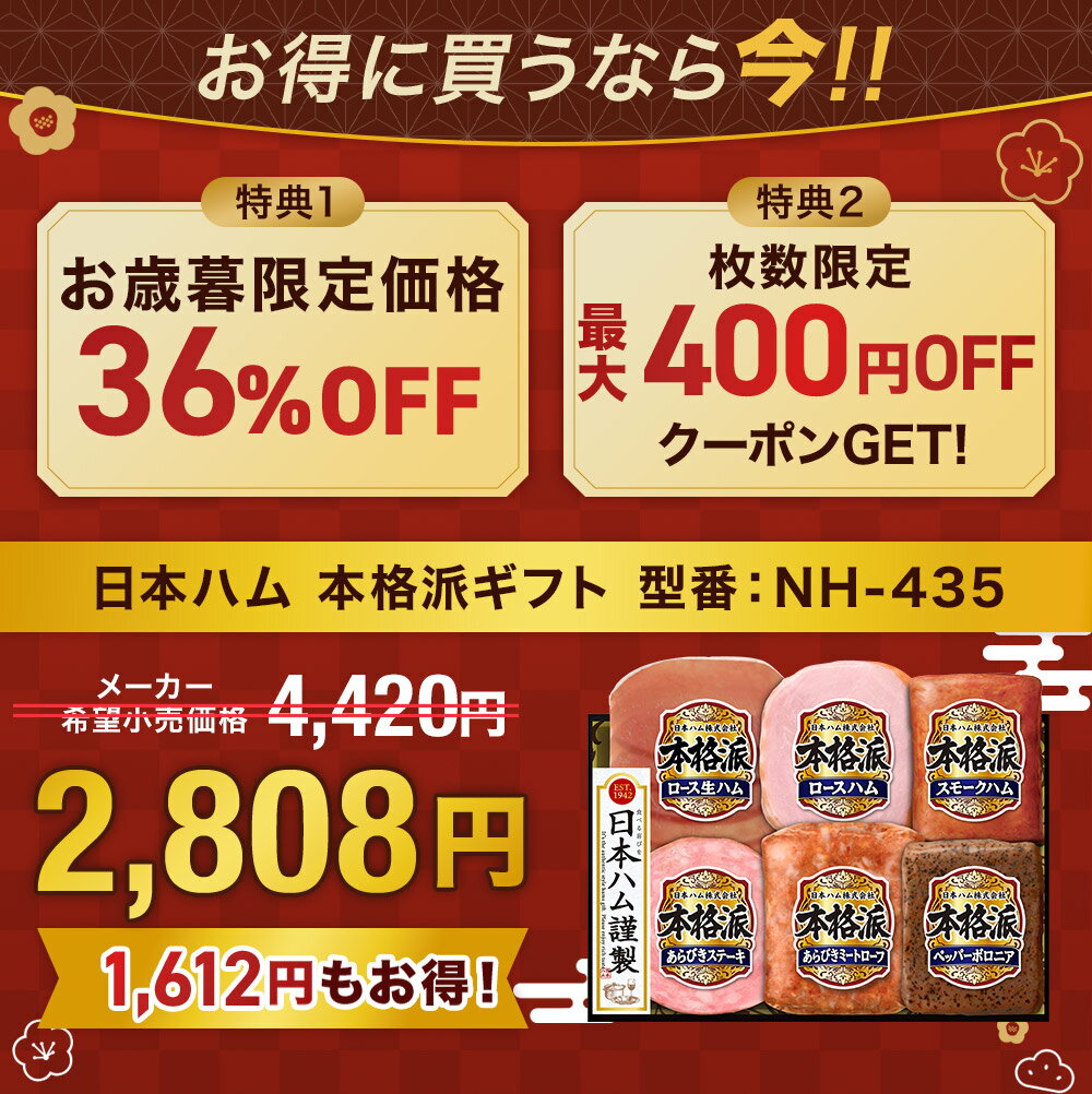 【4,420円→2,808円】 【36%OFF SALE】 【77円OFFクーポン配布中】 お歳暮 早割 クーポン ハム 冬ギフト ギフト 日本ハム 本格派 NH-435 御歳暮 歳暮 2025 送料無料 冬 贈答用 詰め合わせ お取り寄せ 歳暮ギフト 人気 高級 上司 友人 親戚 家族 両親 同僚 内祝い お祝い 御祝