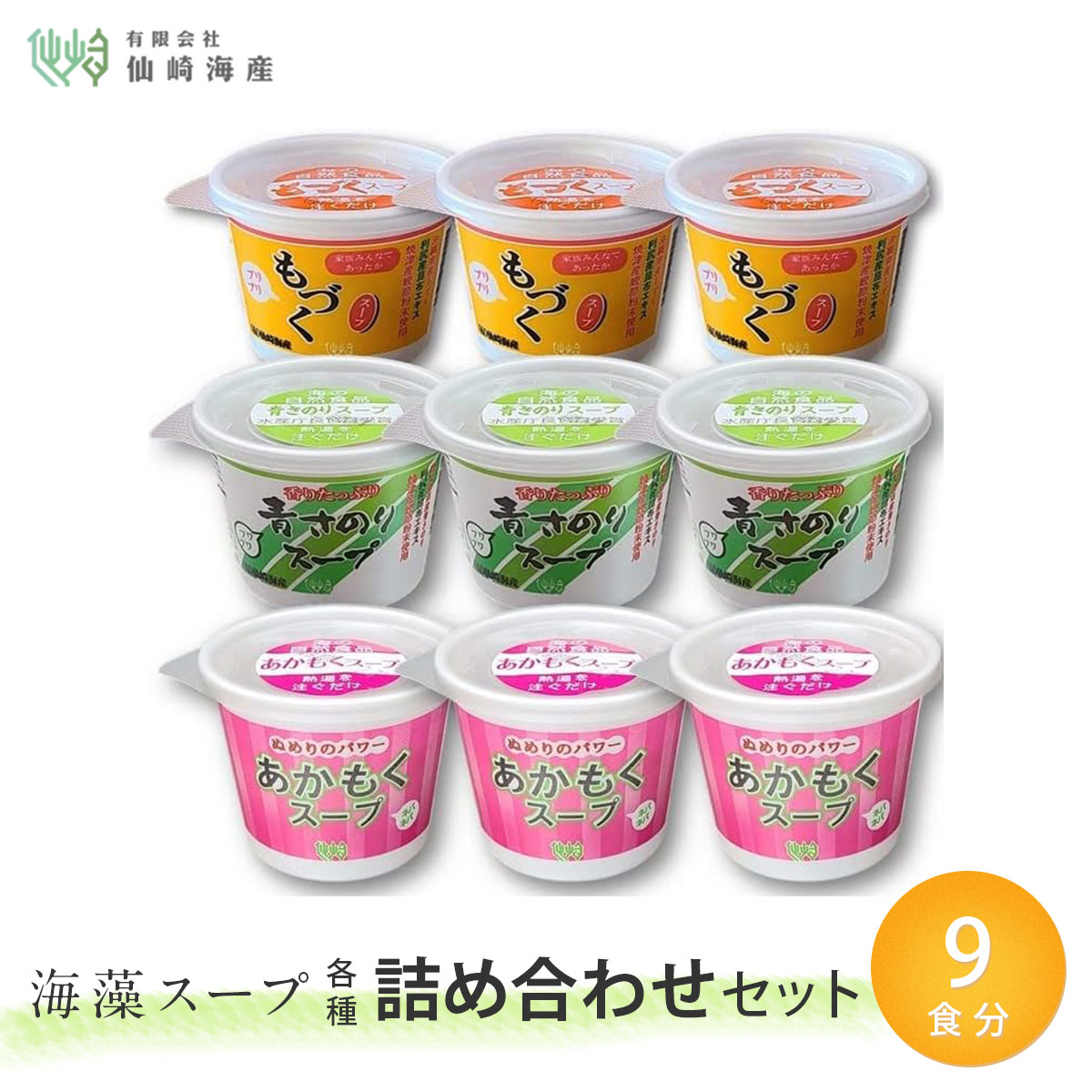 商品情報 名称 海藻スープ3種詰め合わせセット各3個入り計9個 原材料名 ■もづくスープもずく(沖縄県産)、スープ【醤油、食塩、蛋白加水分解物、砂糖、ぶどう糖果糖液糖、味醂、かつおエキス、昆布エキス、いわしエキス、小麦発酵調味料、かつお節粉末】、七味唐辛子(ちんぴ、赤唐辛子、ごま、麻の実、けしの実、山椒、青のり)、乾燥ネギ/調味料(アミノ酸等)、(一部に小麦・大豆・ごまを含む) ■青さのりスープス...