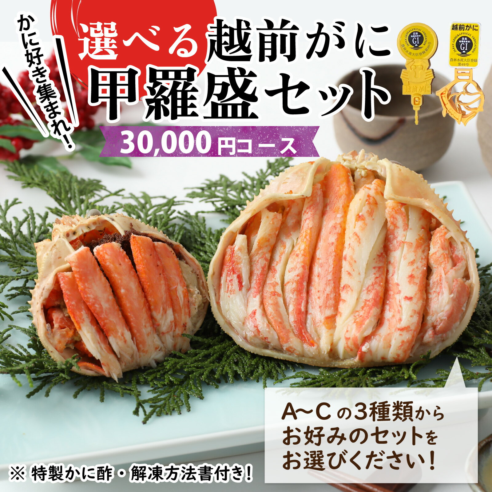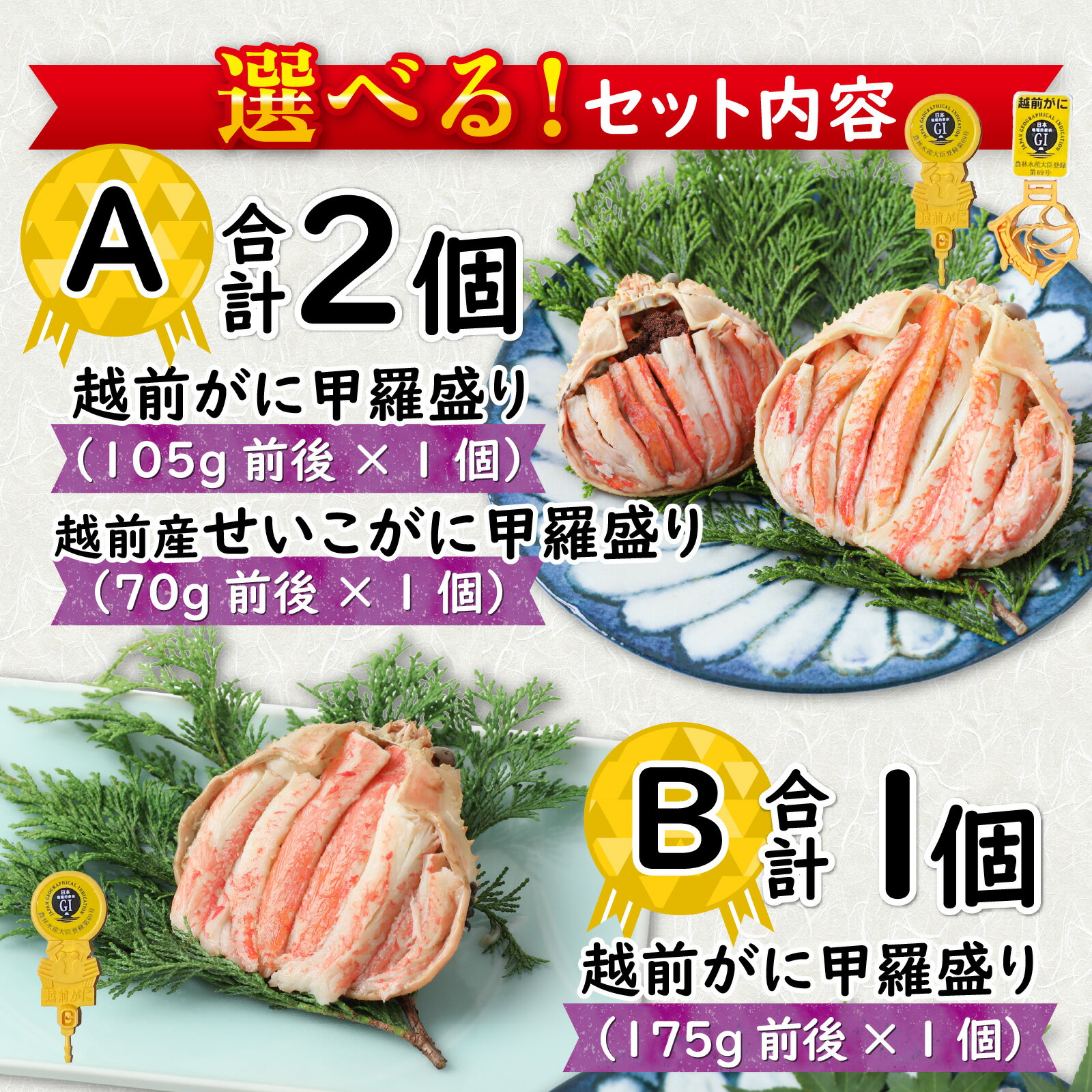 越前産ズワイガニの証 「黄色のブランド蟹タグ」付きです。3種類の内容からお好みのセットをお選びください。