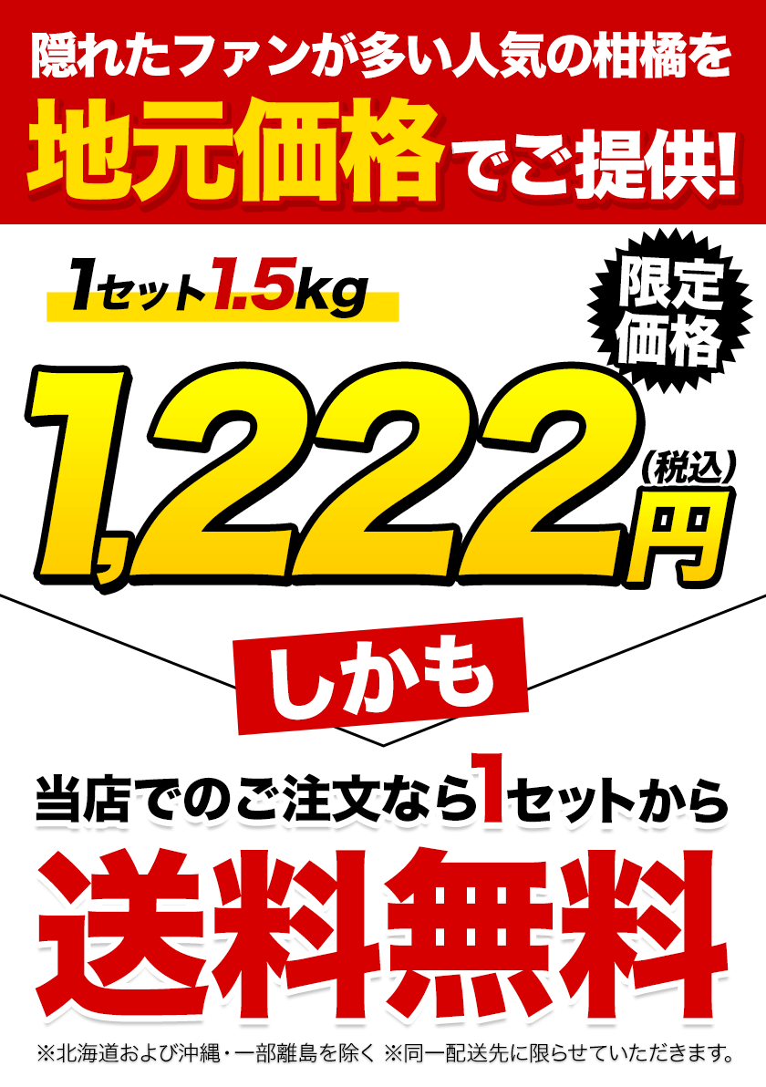 名称 柑橘 産地 熊本県産 内容 3L〜Sサイズ/1.5kg 賞味期限 生ものですので、お早めにお召し上がりください。 保存方法 冷暗所や冷蔵庫などで保管してください。 配送方法 ヤマト運輸、佐川急便、日本郵政の通常便でお届けさせていただきます。 ※配送業者の指定は出来かねます。 ※ご不在時に宅配ボックスへの投函をご希望の方は、お手数ですがご注文時にお届け日指定欄の右端にある 変更ボタンをクリック...