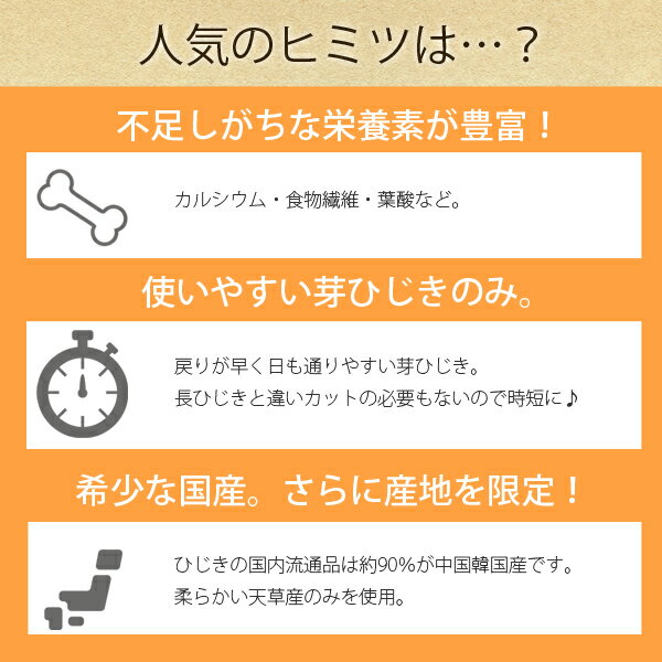 ギフト対応についてラッピング、のし対応ができない商品です。 注文画面でラッピングを選ばれた場合は、キャンセルとさせていただきます。名称乾燥ひじき内容量1個当たり45g原材料名ひじき(熊本県天草産)加工者株式会社友進 福岡県太宰府市水城5丁目15-5販売者株式会社イクス 福岡市南区大楠一丁目3番29号賞味期限パッケージ裏面に記載保存方法高温多湿を避けて、常温、暗所で保存してください。 開封後はお早目...