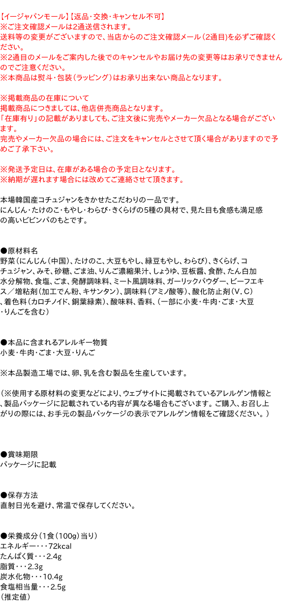 ■商品サイズ(cm)幅約13×奥行約2×高さ約16■内容量100g■商品区分一般食品■原材料野菜(にんじん(中国)、たけのこ、大豆もやし、緑豆もやし、わらび)、きくらげ、コチュジャン、みそ、砂糖、ごま油、りんご濃縮果汁、しょうゆ、豆板醤、食酢、たん白加水分解物、食塩、ごま、発酵調味料、ミート風調味料、ガーリックパウダー、ビーフエキス/増粘剤(加工でん粉、キサンタン)、調味料(アミノ酸等)、酸化防止...