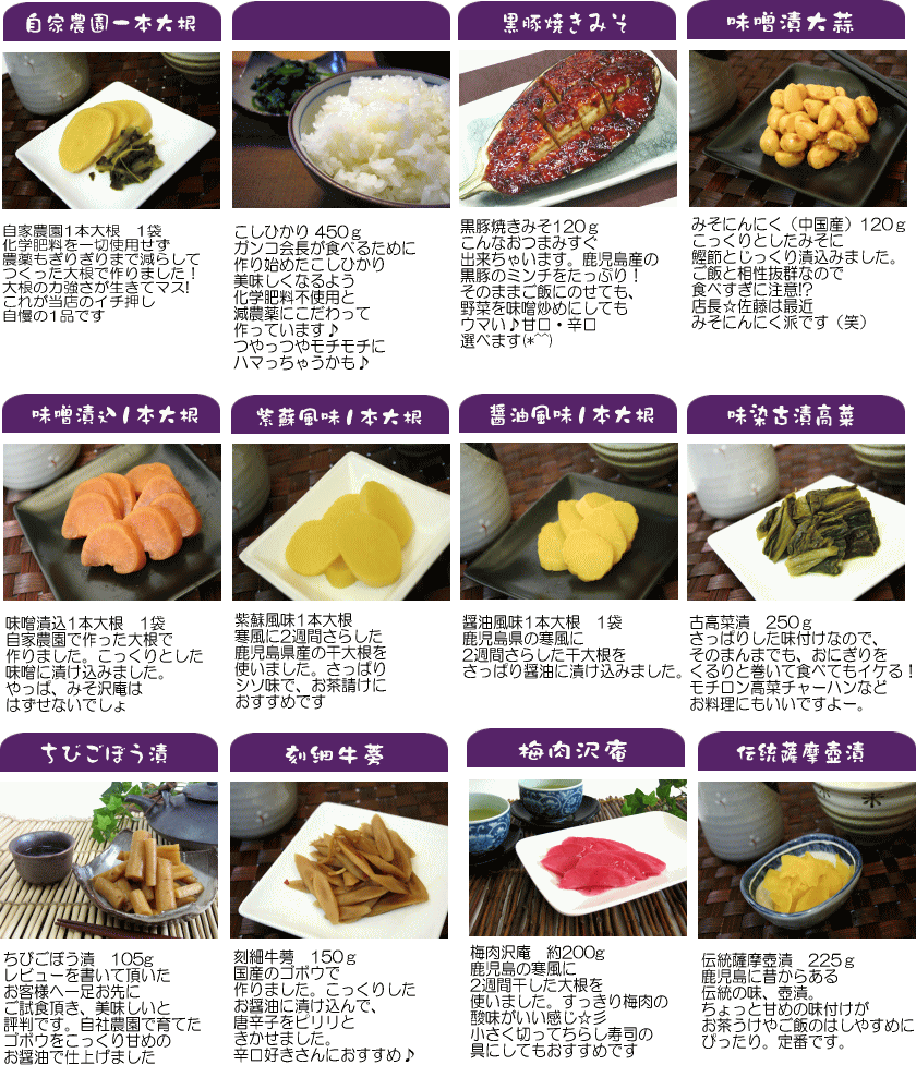 商品情報原材料名やみつき明太子(80g)すけとうだらの卵、岩のり、唐辛子、食塩、清酒、みりん、ねぎ、醤油、ゴマ油、にんにく、ごま/調味料(アミノ酸等)イカキムチ(100g)イカ塩辛(北海道産)唐辛子、砂糖、 魚醤、 酒精、 ゴマ、 ゴマ油 /調味料(アミノ酸等) チンゲン菜キムチ(150g)チンゲン菜(国産)漬け原材料(唐辛子、砂糖、米粉、食塩、イカ、アミエビ、しょうが、ニンニク、ゴマ、ねぎ/調味...