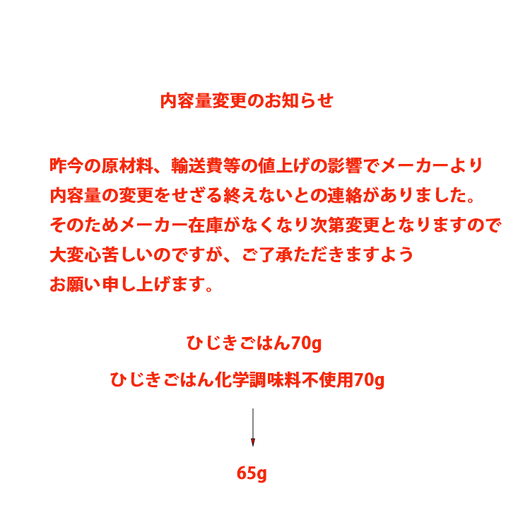 名称ふりかけ原材料名炒りごま(国内製造)、ぶどう糖、ポテトフレーク、でん粉、粒状大豆たん白、砂糖、アカムツ、かつお風味顆粒(乳糖、食塩、鰹節粉末、砂糖、その他)、食塩、醤油、のり、発酵調味料、鰹節粉末、粉末醬油、乾燥ネギ、デキストリン、乾燥おから、トマトパウダー、香辛料、野菜エキスパウダー/加工でん粉、調味料(アミノ酸等)、着色料(カラメル、カロチノイド、ラック)、貝Ca、甘味料(カンゾウ、ステビ...