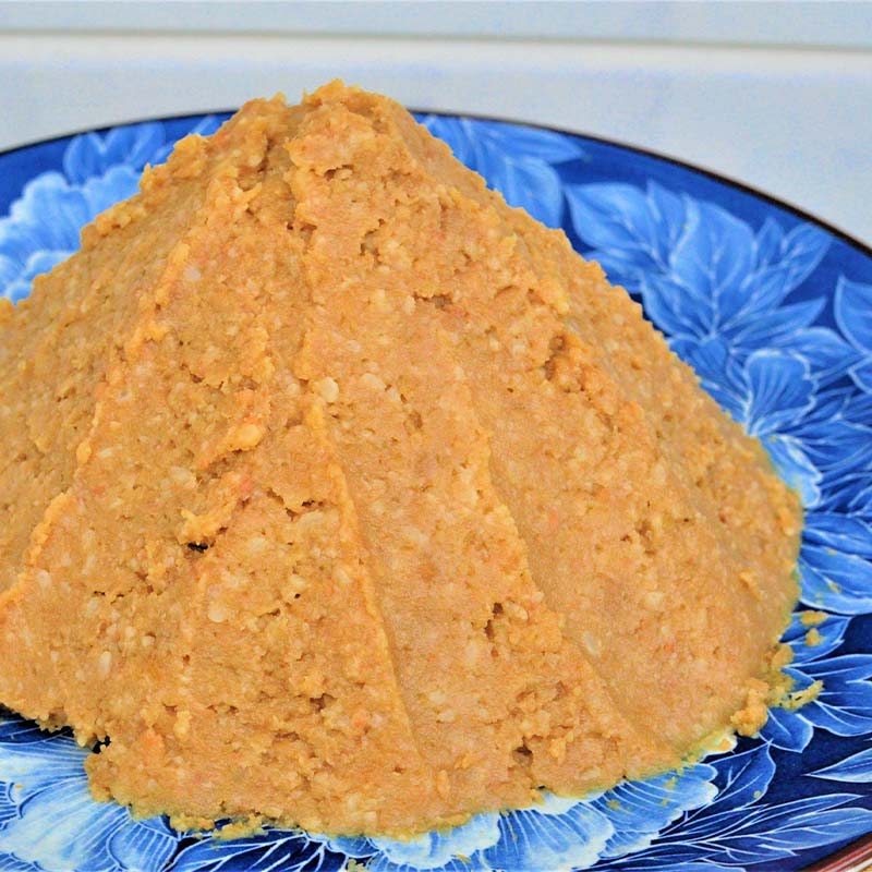 赤マルソウの代表格のご当地みそ。郷土料理イナムドゥチ用の低塩の甘口タイプの白みそ。米麹みそのスリタイプ。色が淡く粒がないのでみそ汁のほか加工用としても最適。