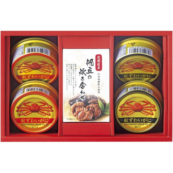 ●商品名/海鮮づくし CRH-G●商品内容/紅ずわいがに(ほぐし身)55g・紅ずわいがに(脚肉入り)55g×2、帆立炊き合わせ35g×1●箱サイズ/約35.7×28.7×3.5cm●賞味期限/製造日より360日●アレルゲン/小麦・かに●生産国/日本●重量/約585g紅ずわいがにを使用したカニ缶は、チャーハンやサラダ、スープ等幅広くアレンジでき北海道産の帆立を使用した帆立の炊き合わせは帆立の食感をお...